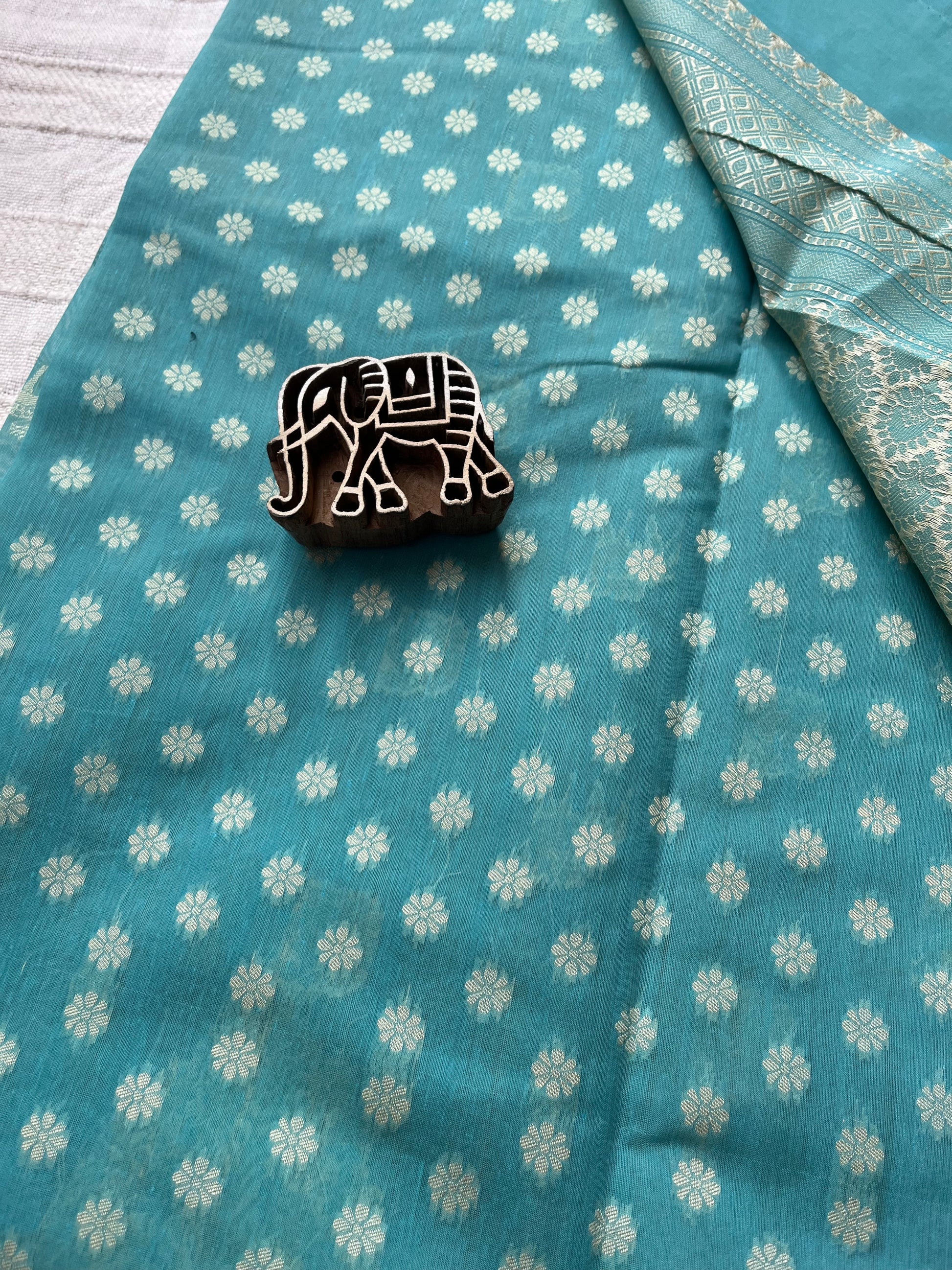 Immerse yourself in elegance with this exquisite mercerised cotton saree featuring luxurious Banarasi weaving. The rich mercerised fabric offers a silky sheen and lightweight comfort, while the intricate Banarasi motifs add a touch of heritage grandeur. Delicately woven patterns inspired by traditional artistry make this saree an enchanting blend of tradition and sophistication.