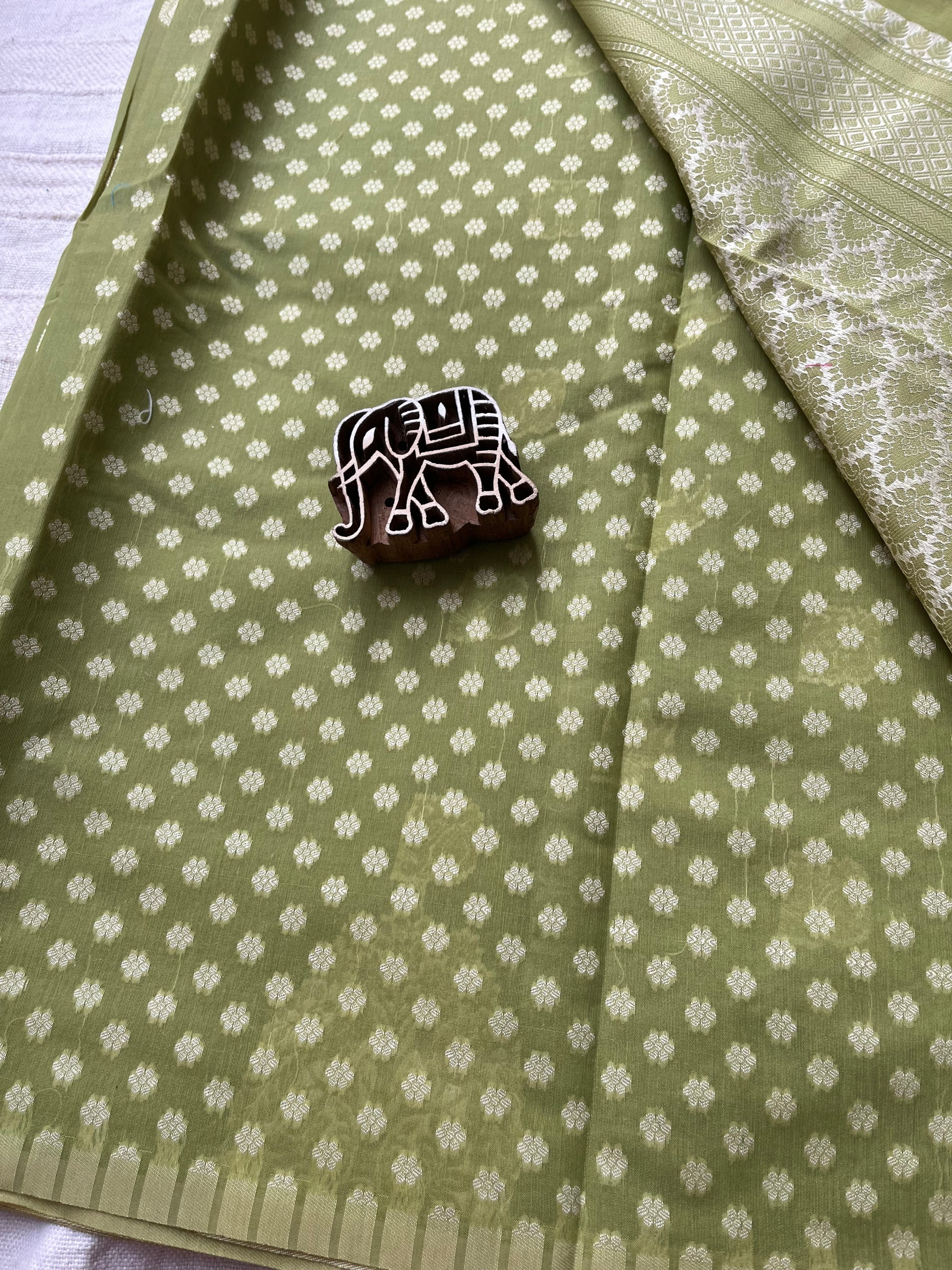 Immerse yourself in elegance with this exquisite mercerised cotton saree featuring luxurious Banarasi weaving. The rich mercerised fabric offers a silky sheen and lightweight comfort, while the intricate Banarasi motifs add a touch of heritage grandeur. Delicately woven patterns inspired by traditional artistry make this saree an enchanting blend of tradition and sophistication.