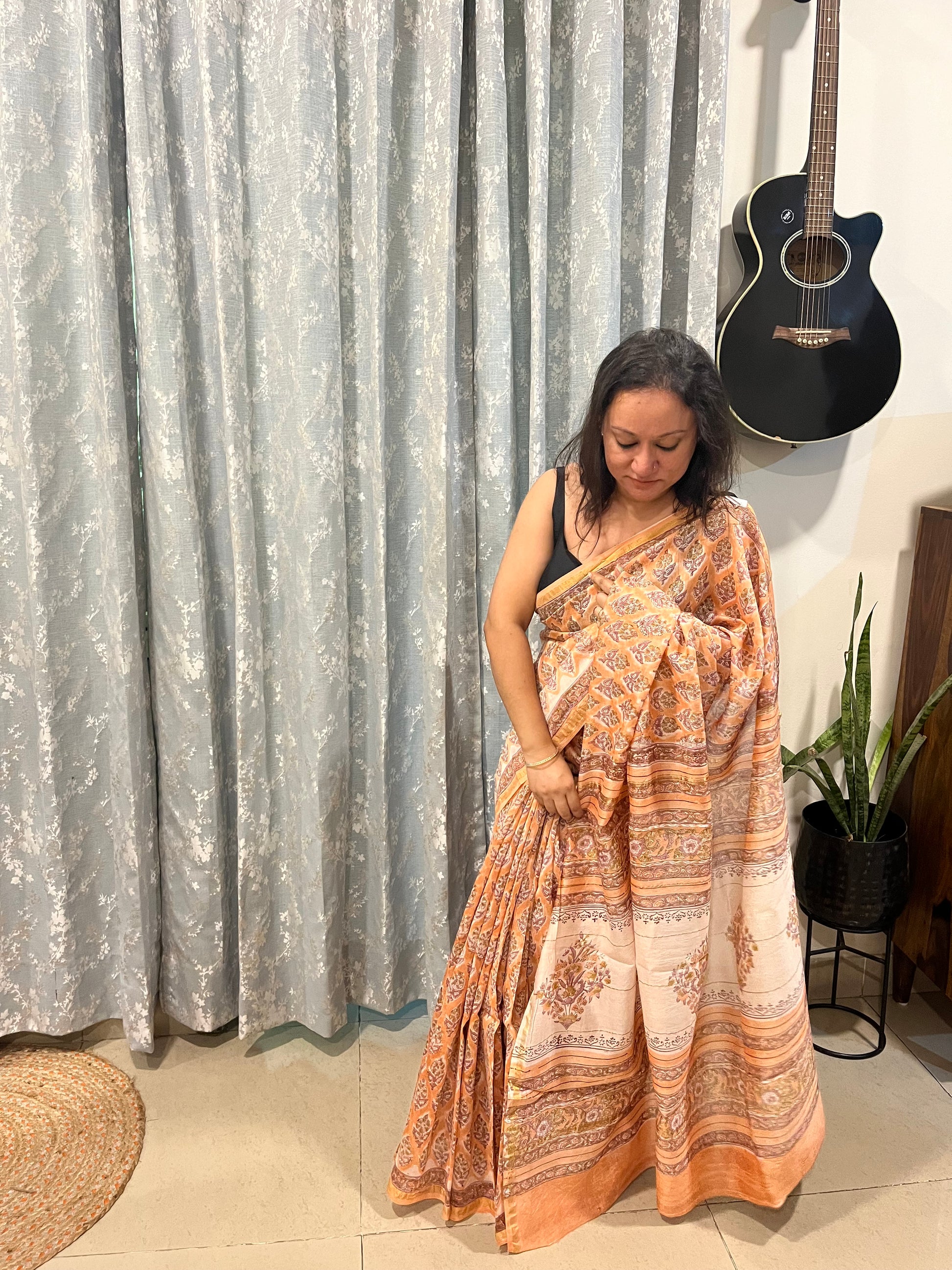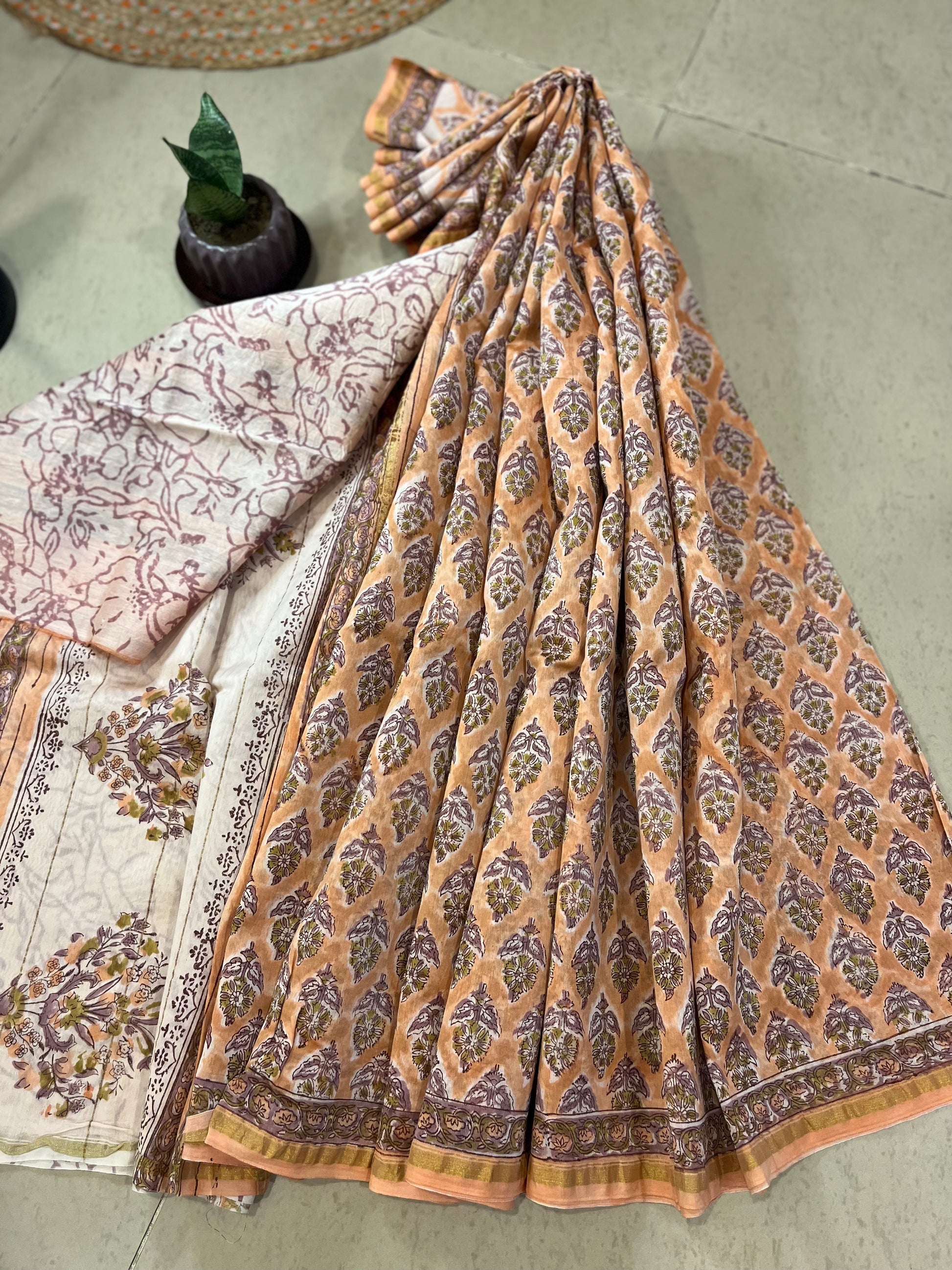 Experience the timeless elegance of our Handblock Chanderi Cotton Silk Saree. This exquisite piece combines the soft, luxurious feel of silk with the lightness and comfort of cotton, creating a perfect blend for any occasion.