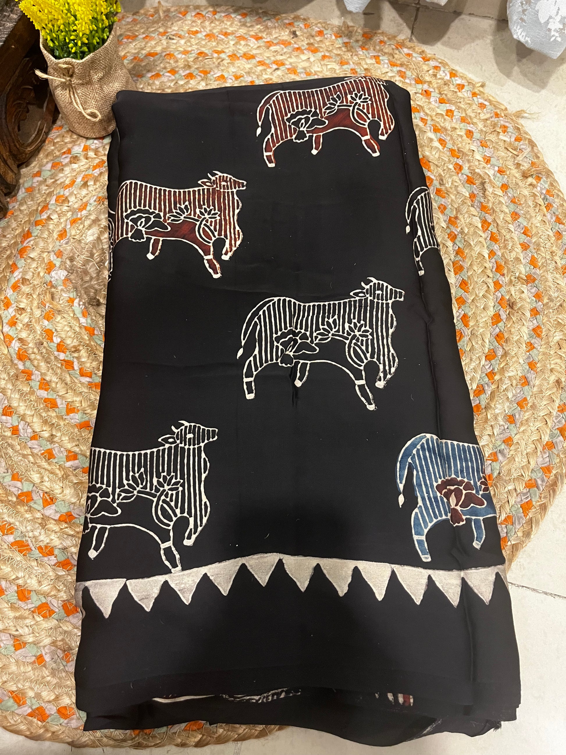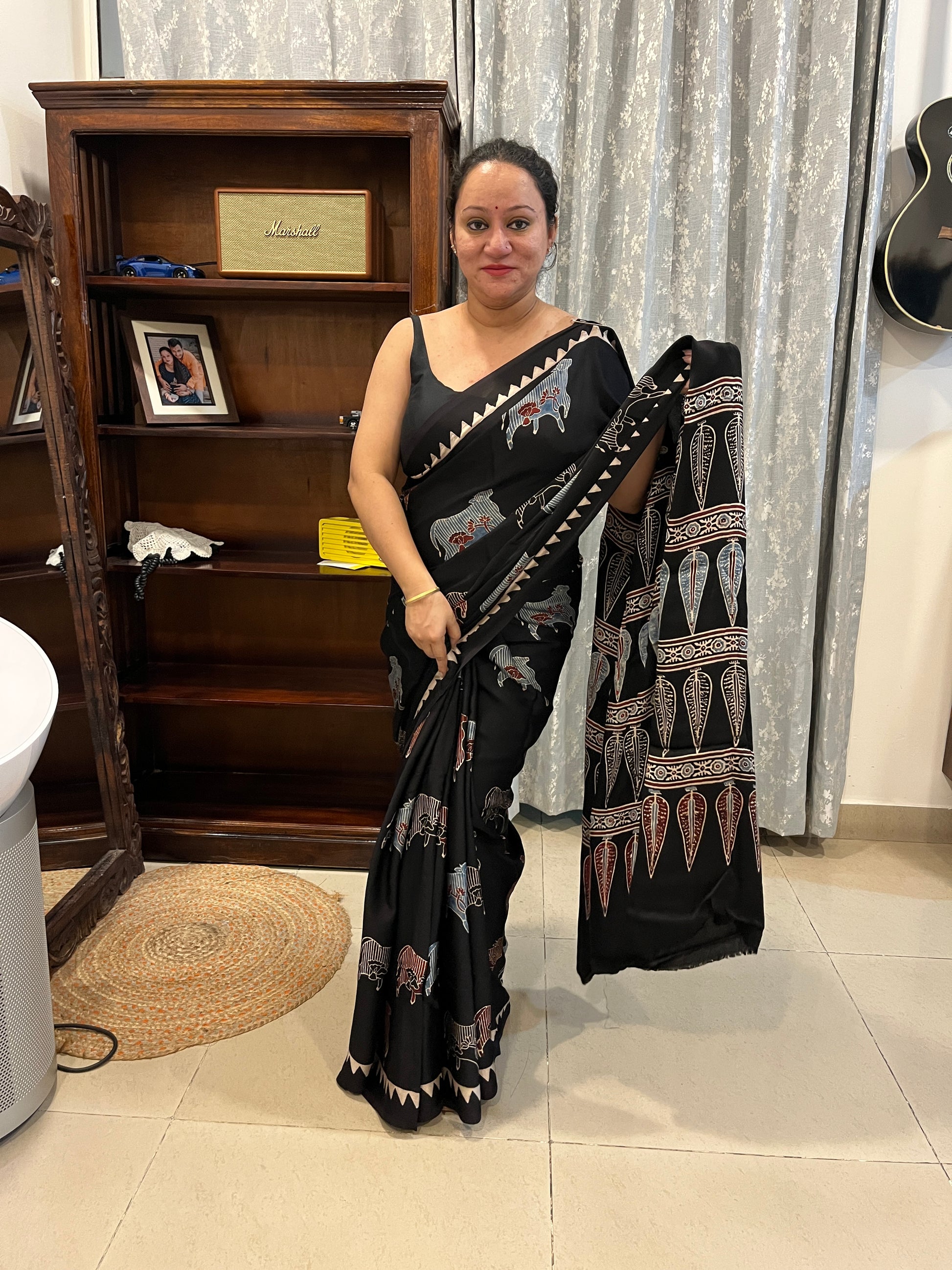 Pichwai Print Modal Silk Saree - Black
