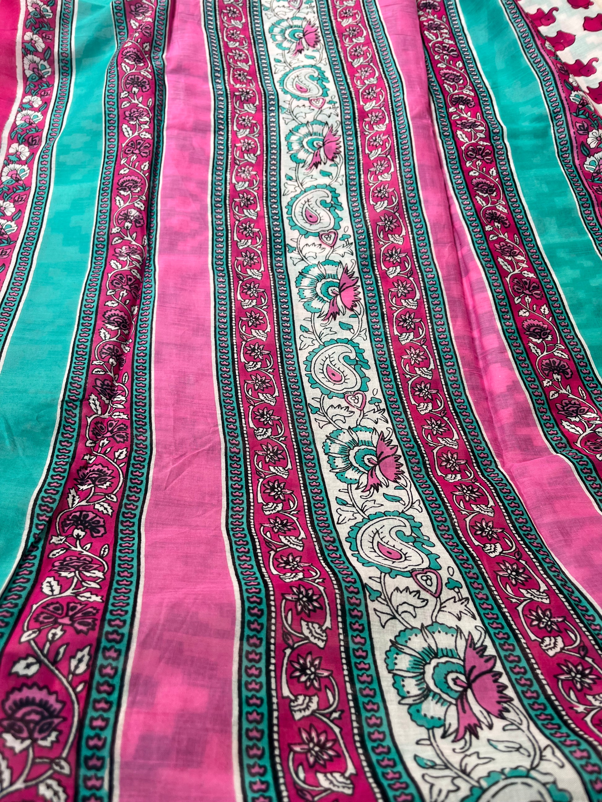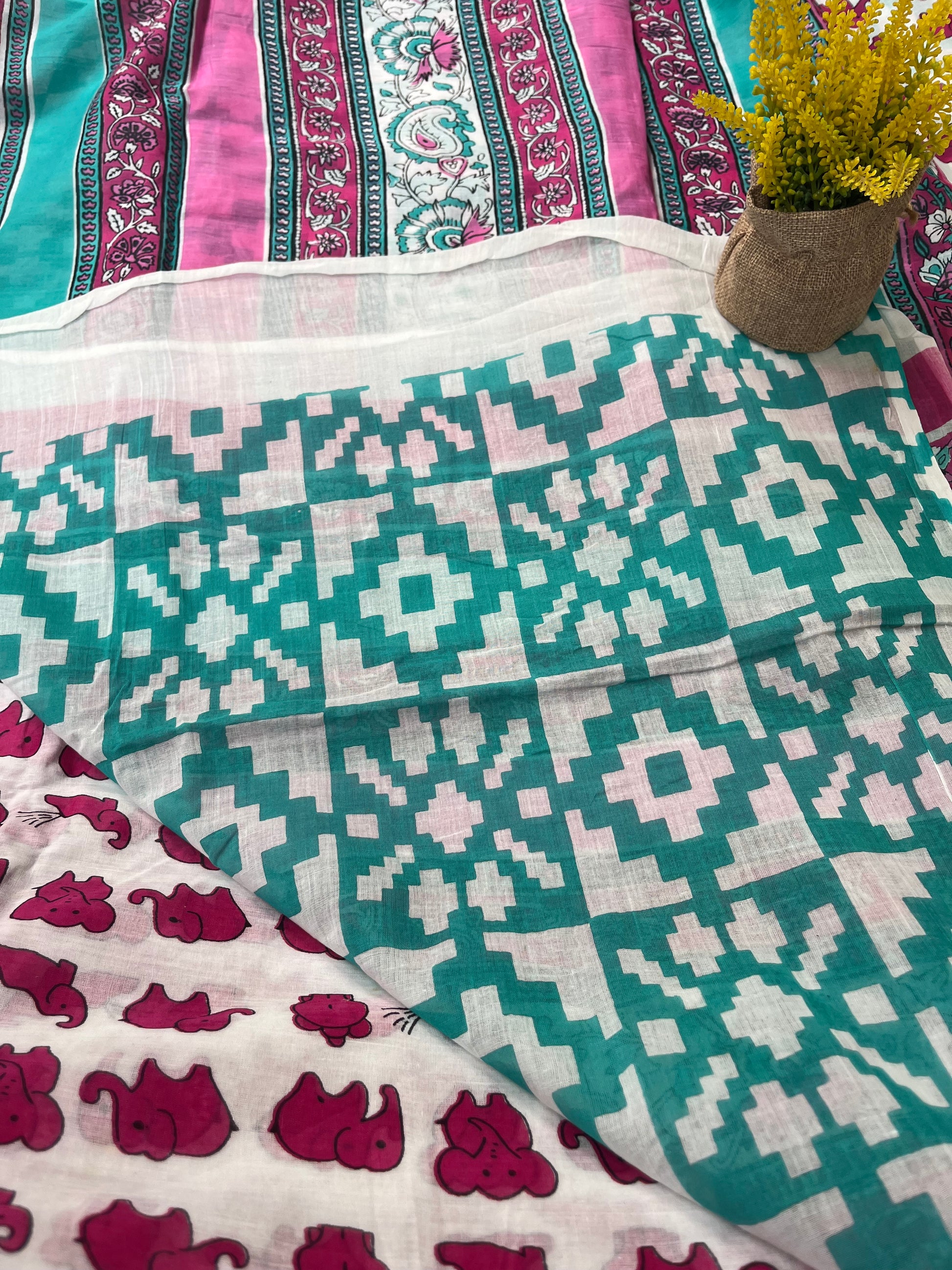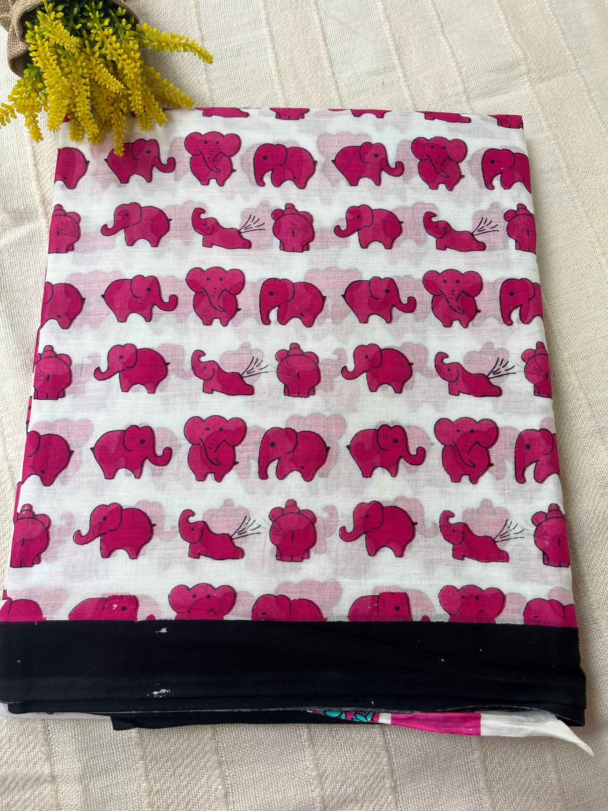 Quirky screenprint mul mul cotton sarees are a delightful fusion of traditional elegance and modern charm. Made from mul mul cotton, known for its softness and lightweight texture, these sarees offer unmatched comfort and breathability.