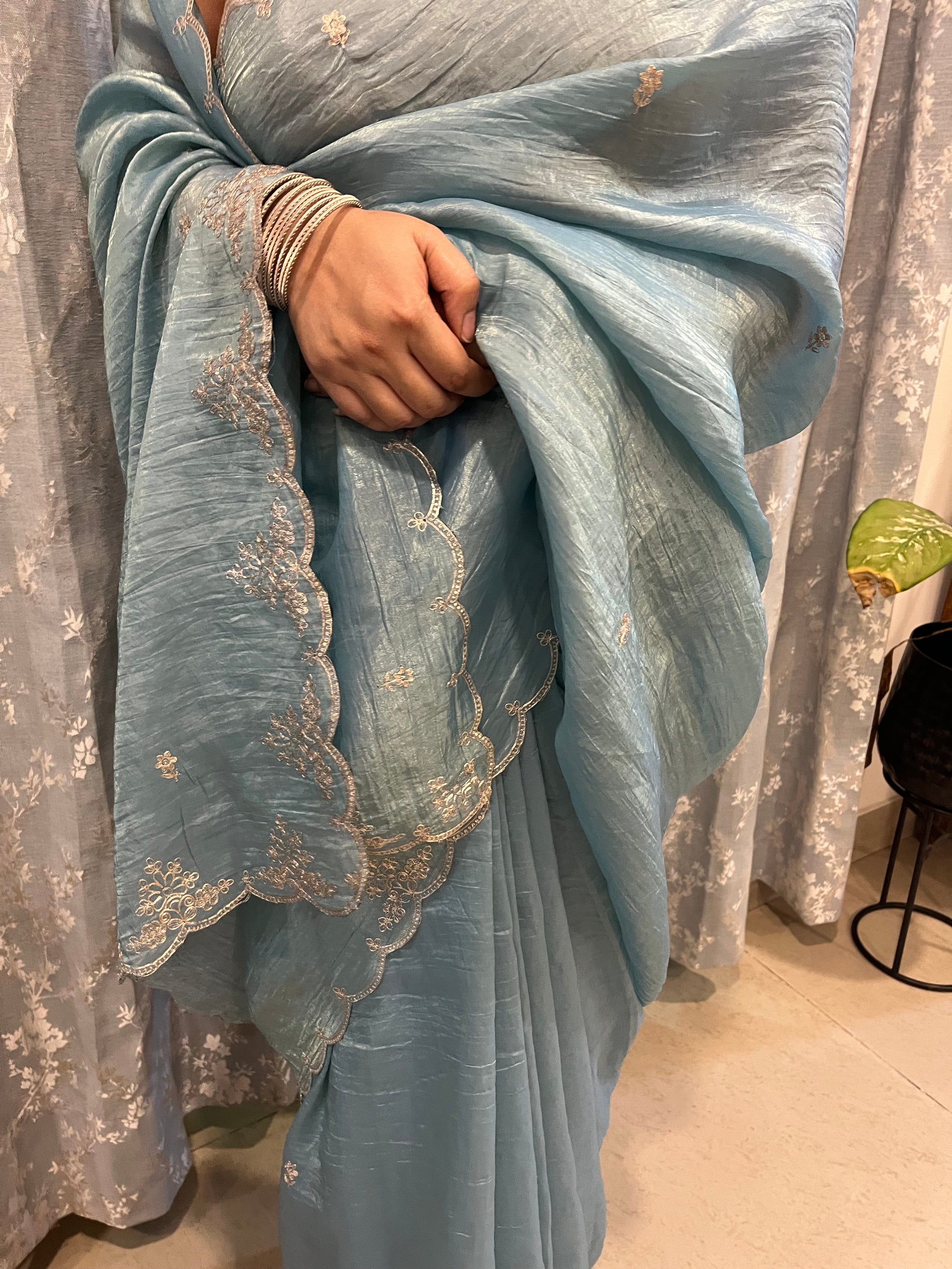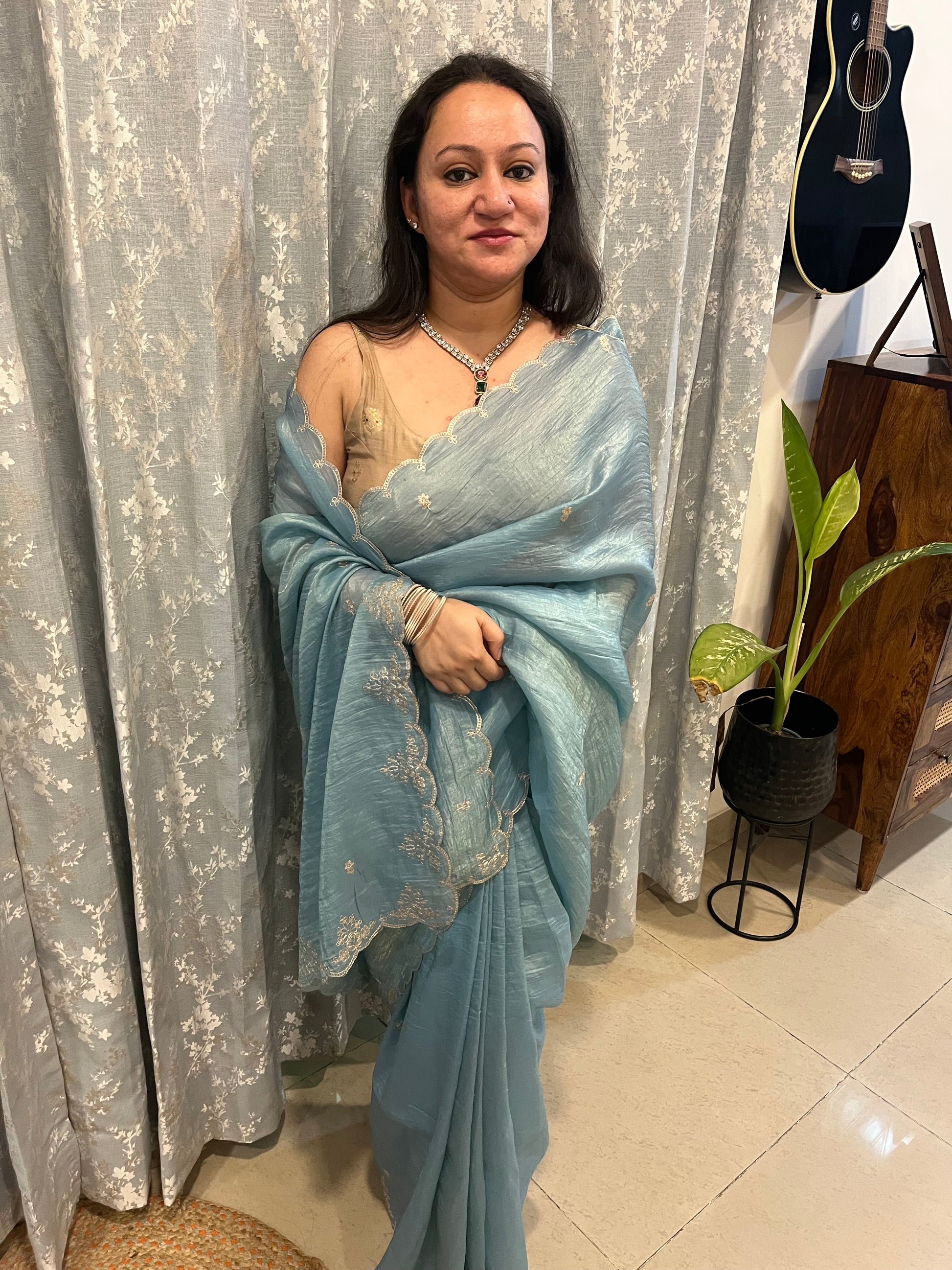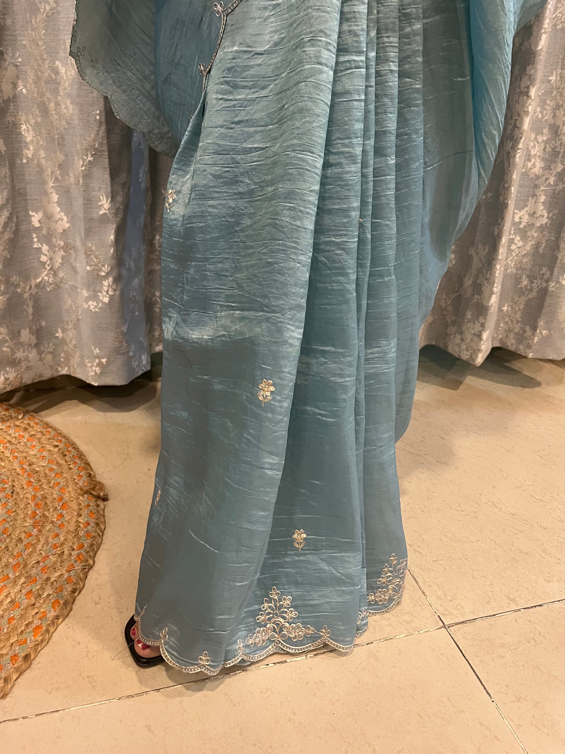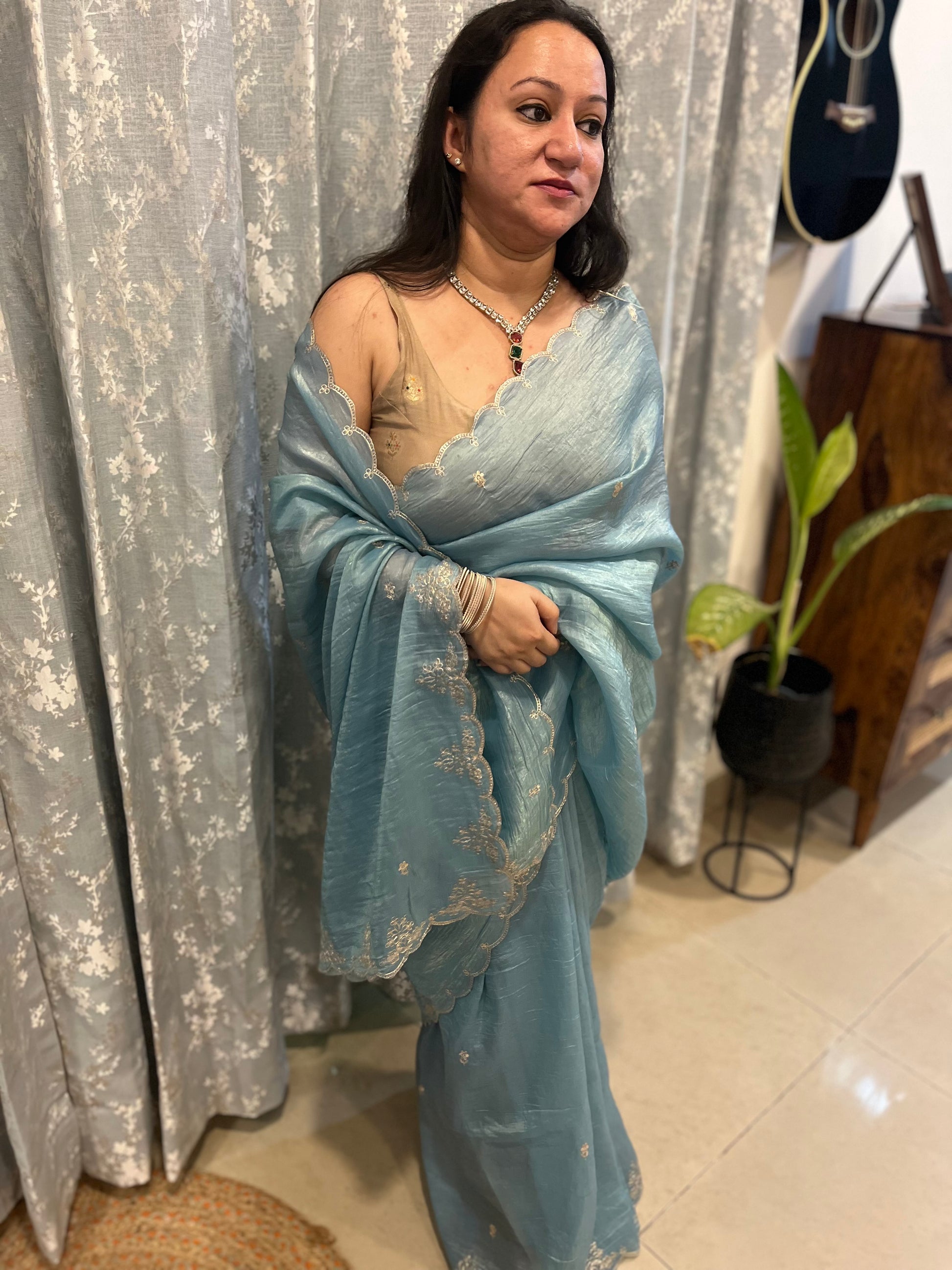Drape yourself in timeless elegance with our Pitta Work Crepe Tissue Saree – a harmonious blend of tradition and modernity. Crafted on a luxurious crepe tissue base, this saree features the intricate brilliance of Pitta work — delicate hand embroidery done using metallic threads, evoking a regal shimmer and rich texture.