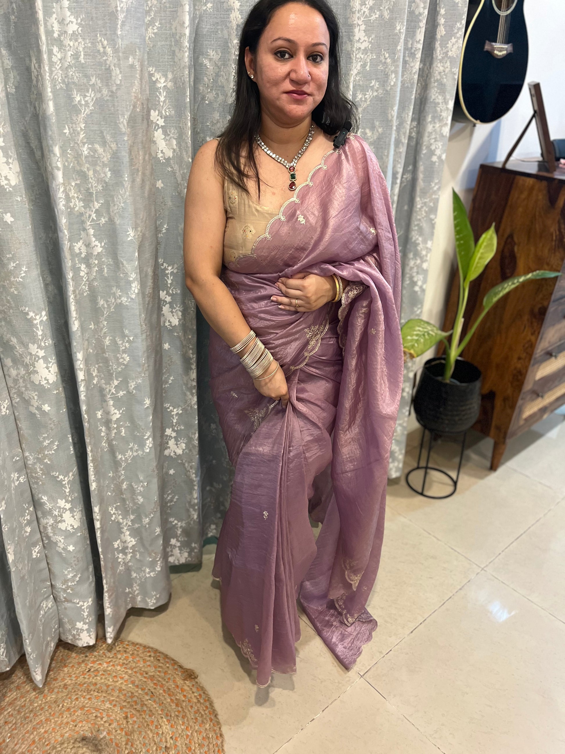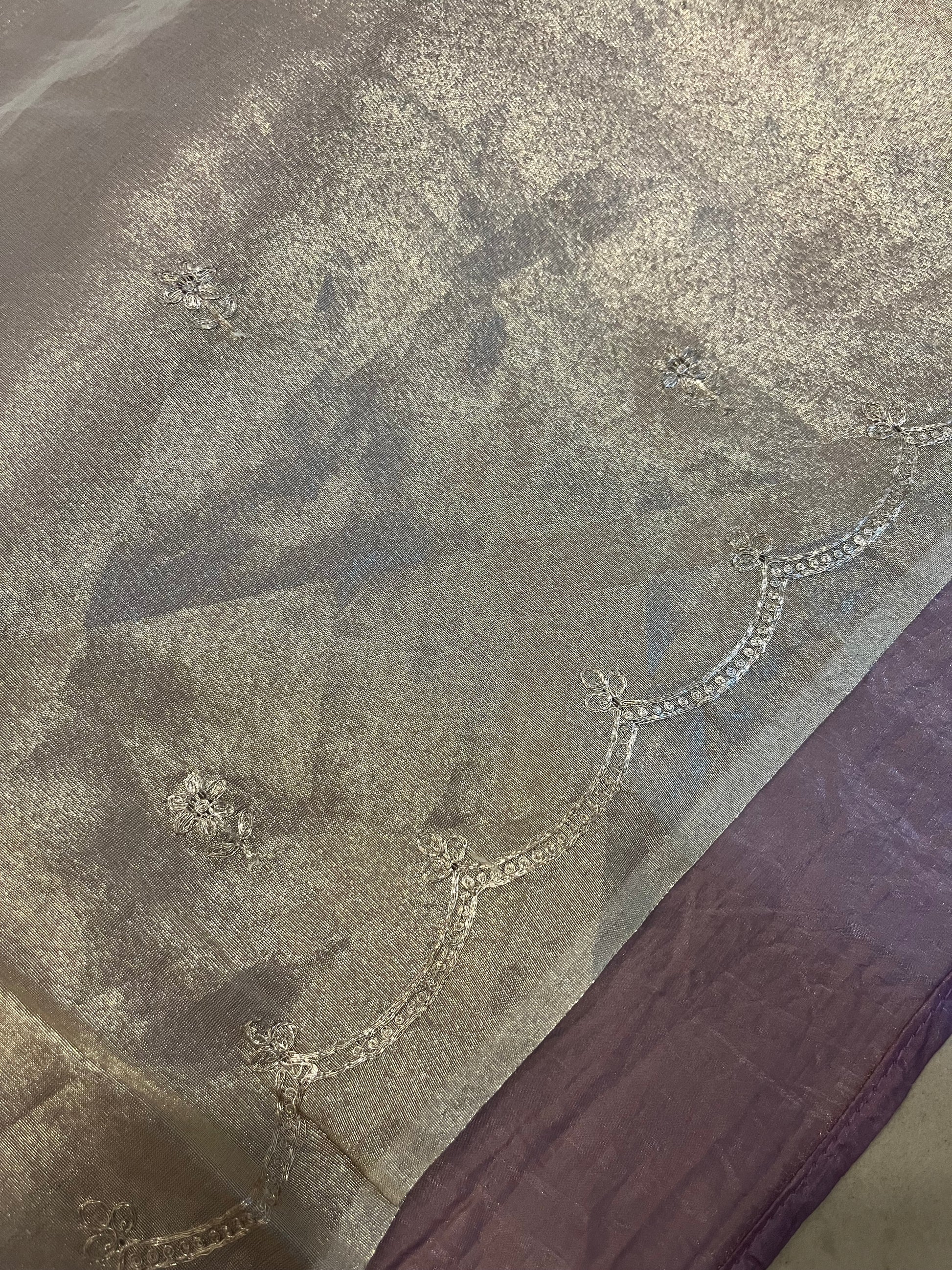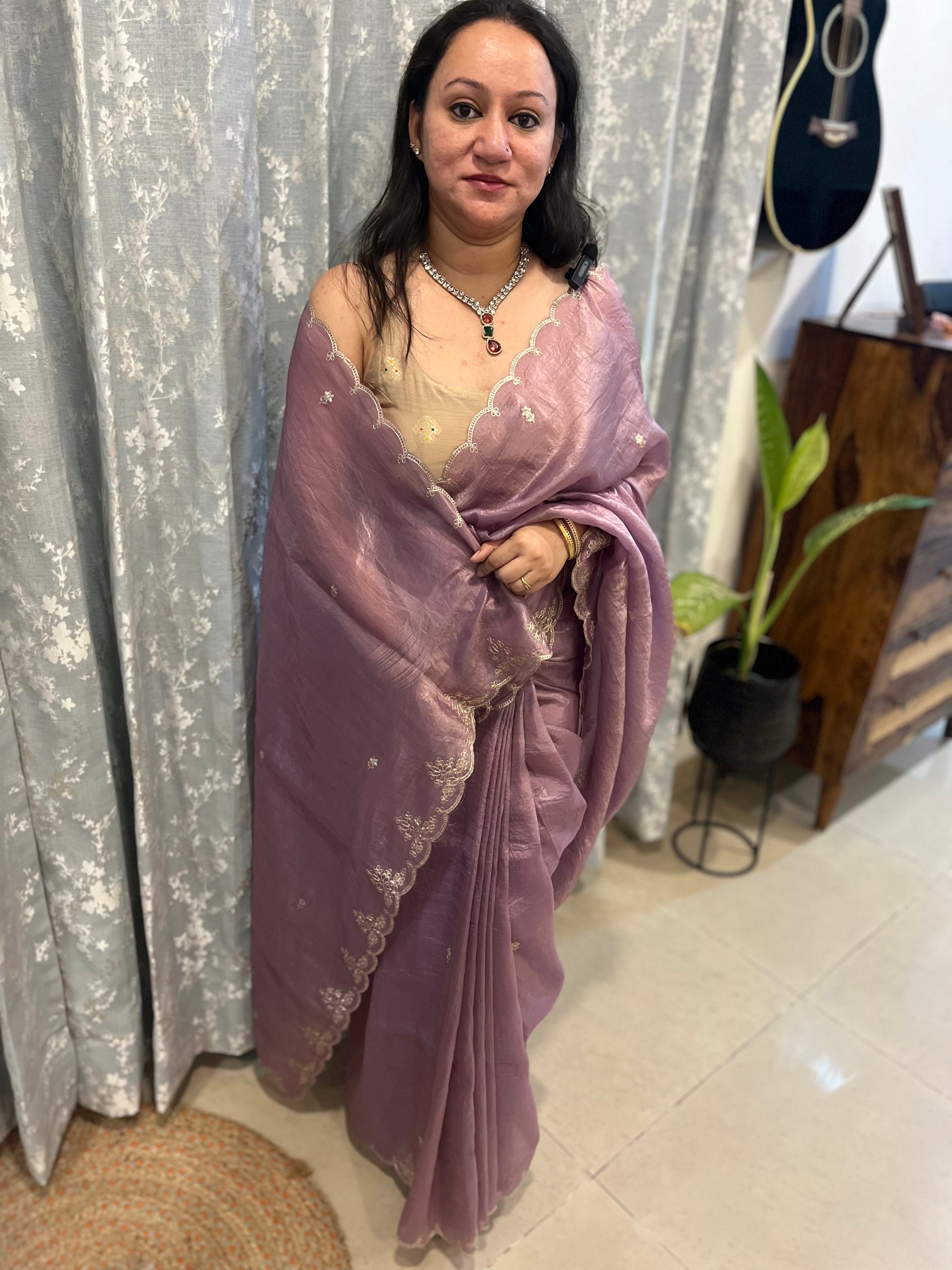 Drape yourself in timeless elegance with our Pitta Work Crepe Tissue Saree – a harmonious blend of tradition and modernity. Crafted on a luxurious crepe tissue base, this saree features the intricate brilliance of Pitta work — delicate hand embroidery done using metallic threads, evoking a regal shimmer and rich texture.
