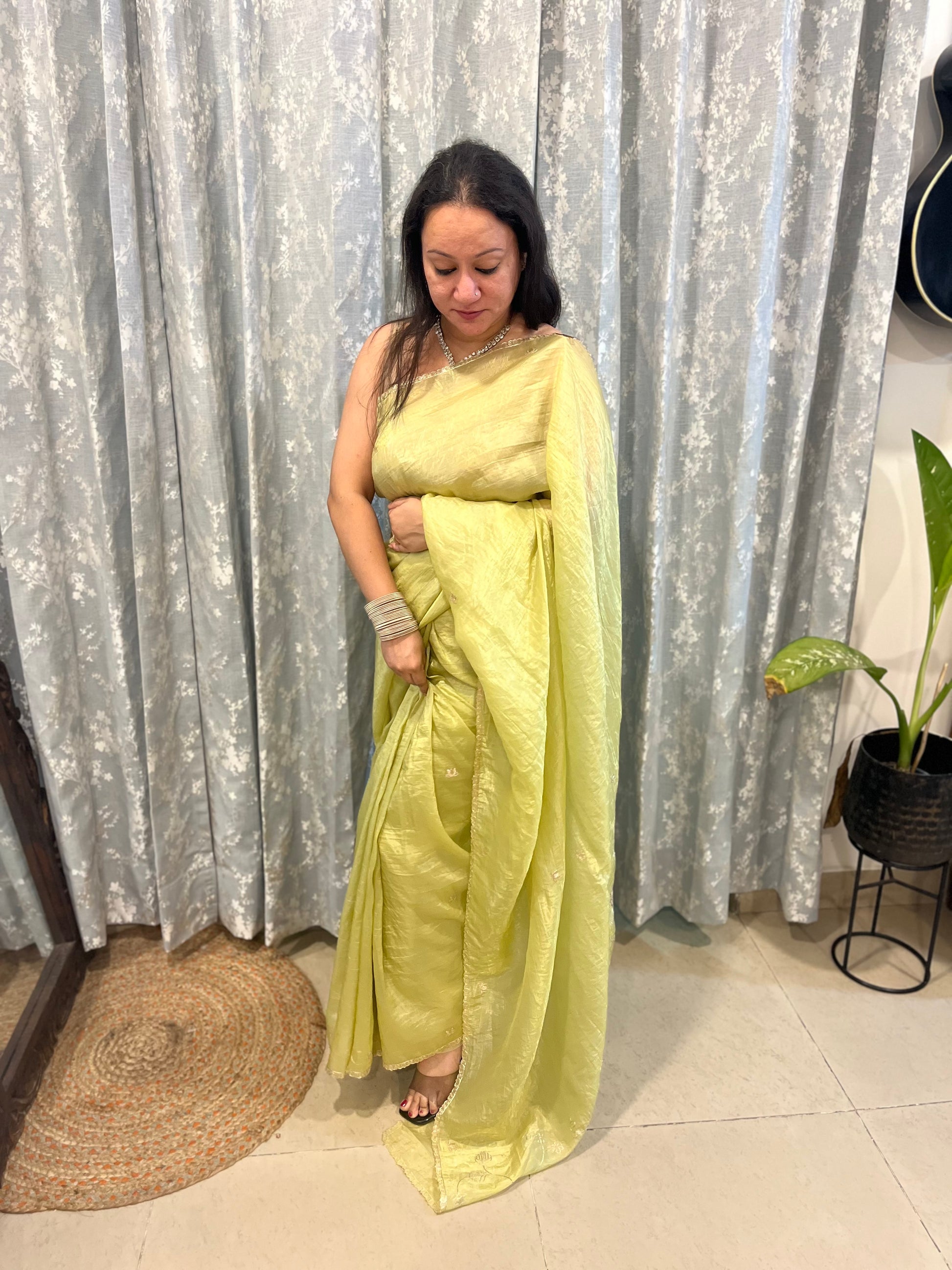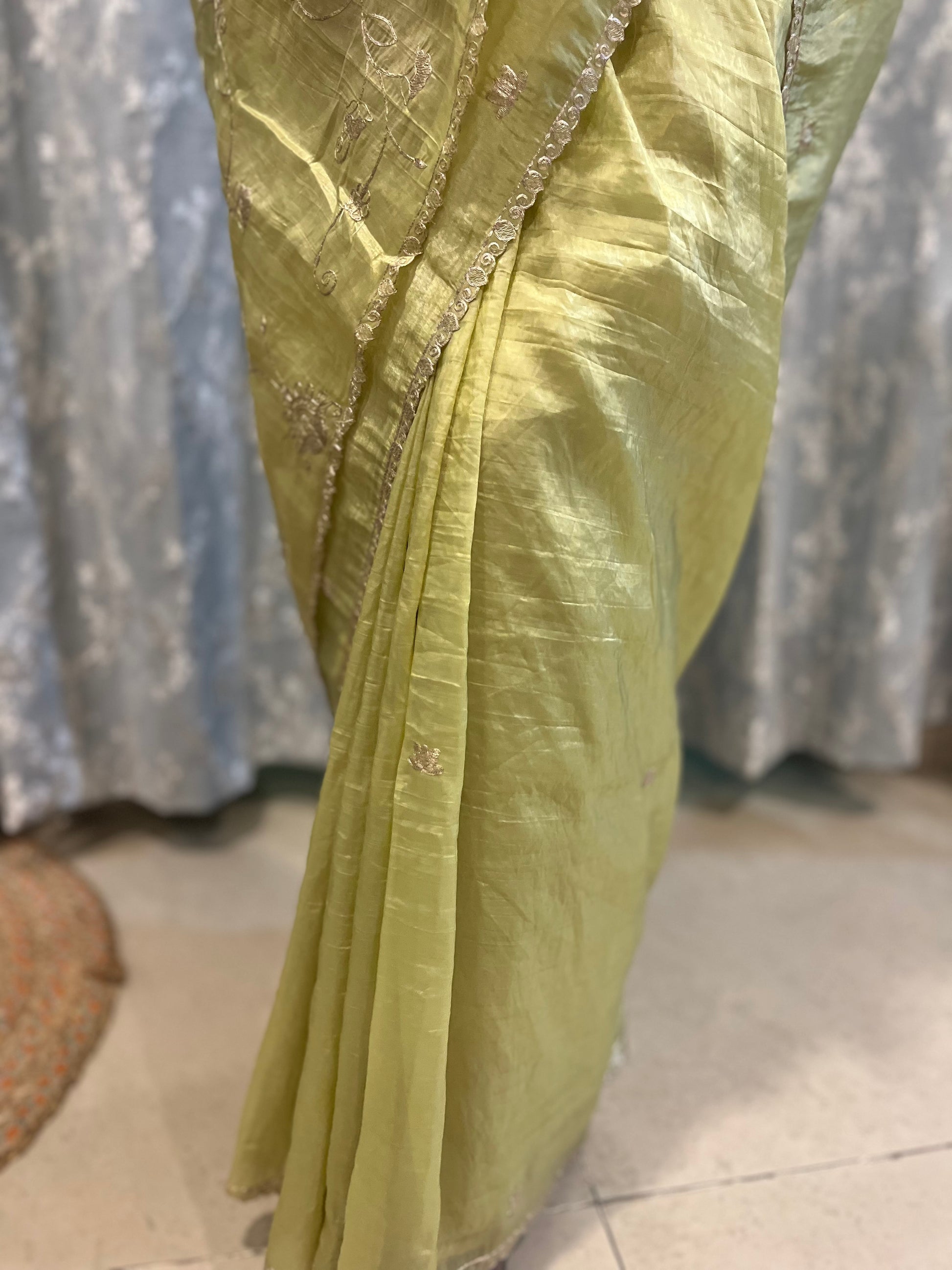 Pitta Work Crepe Tissue Saree - Mehendi Green