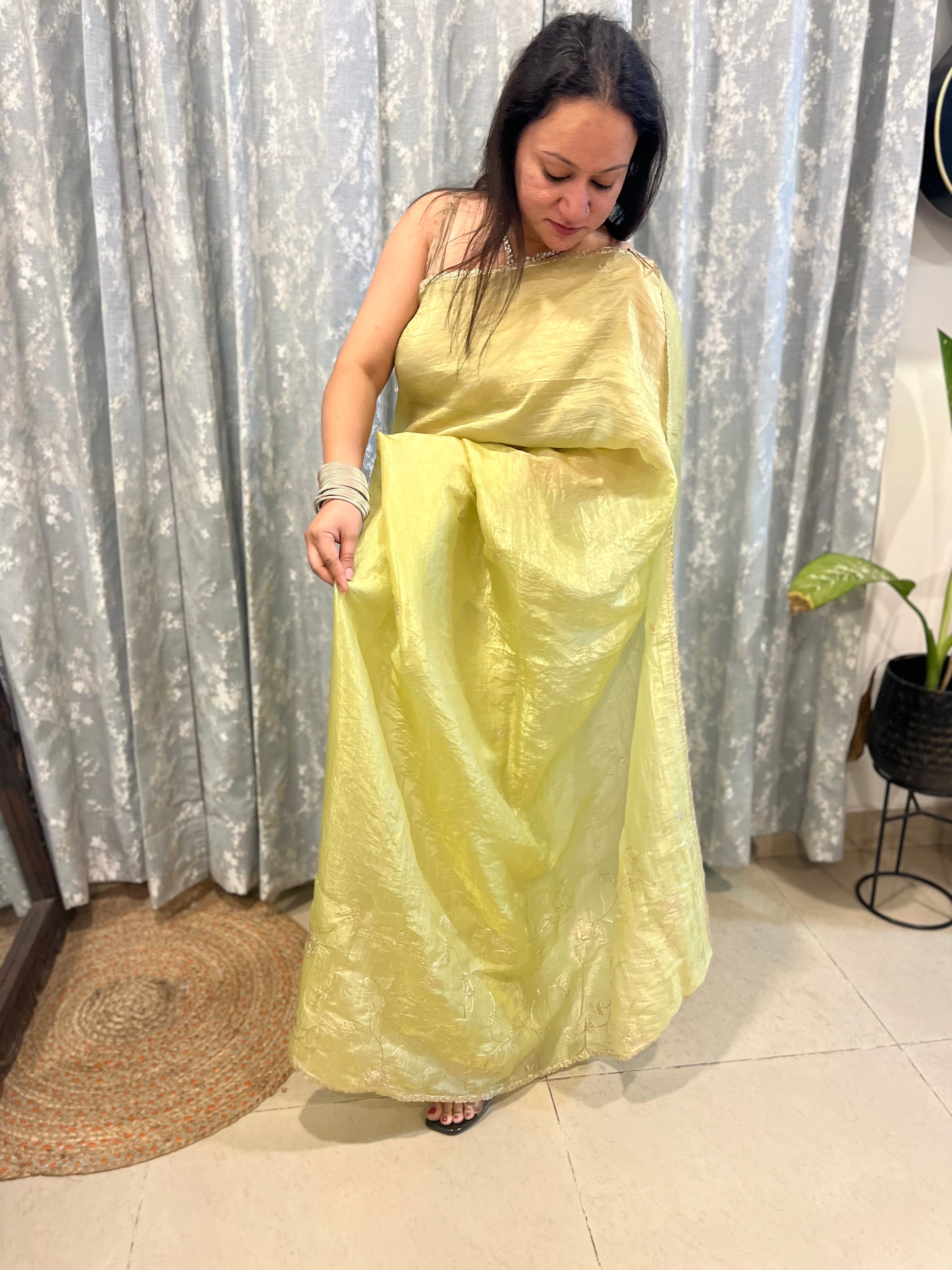 - Blouse: 1m gold tissue blouse piece with pitta work