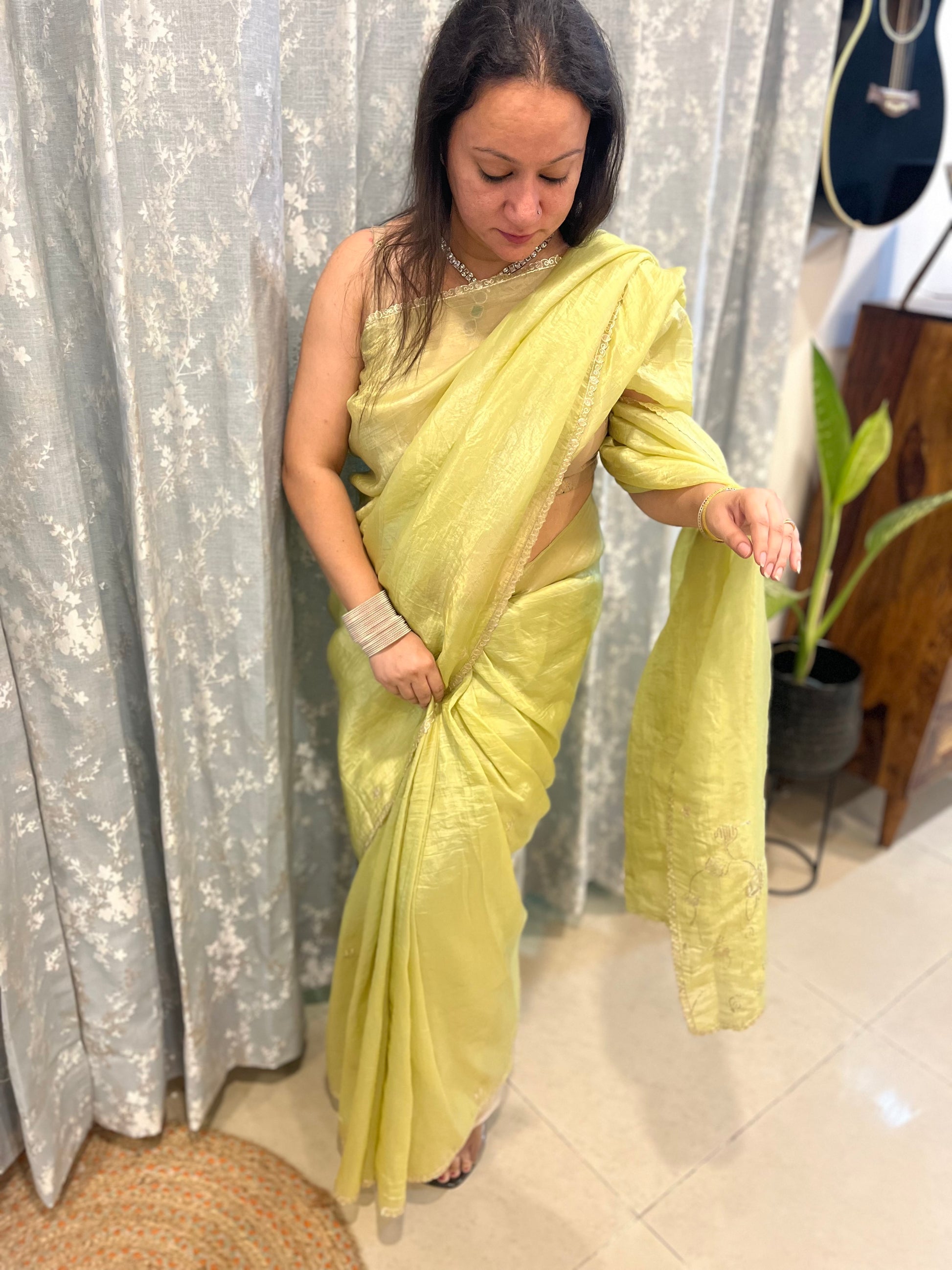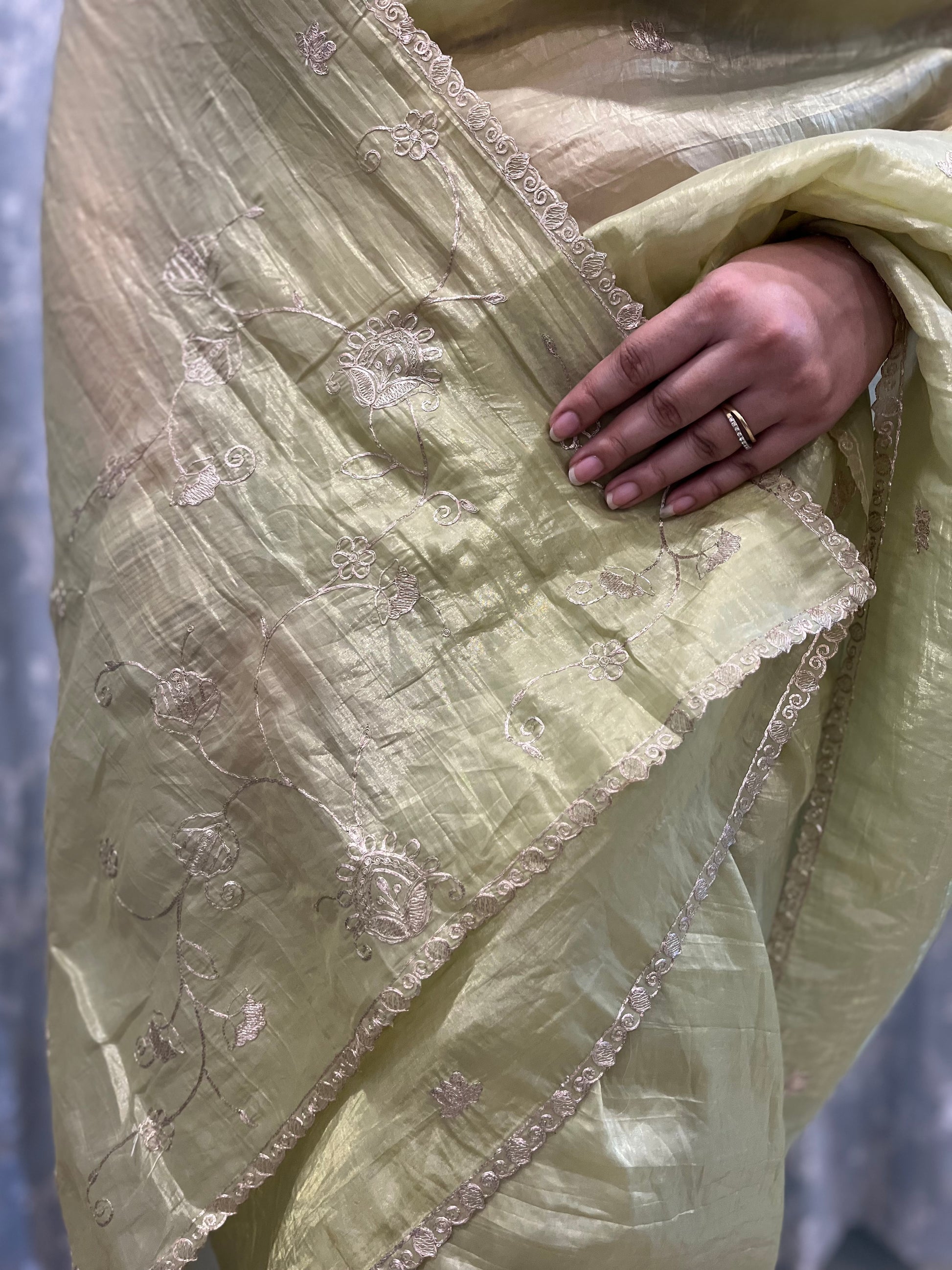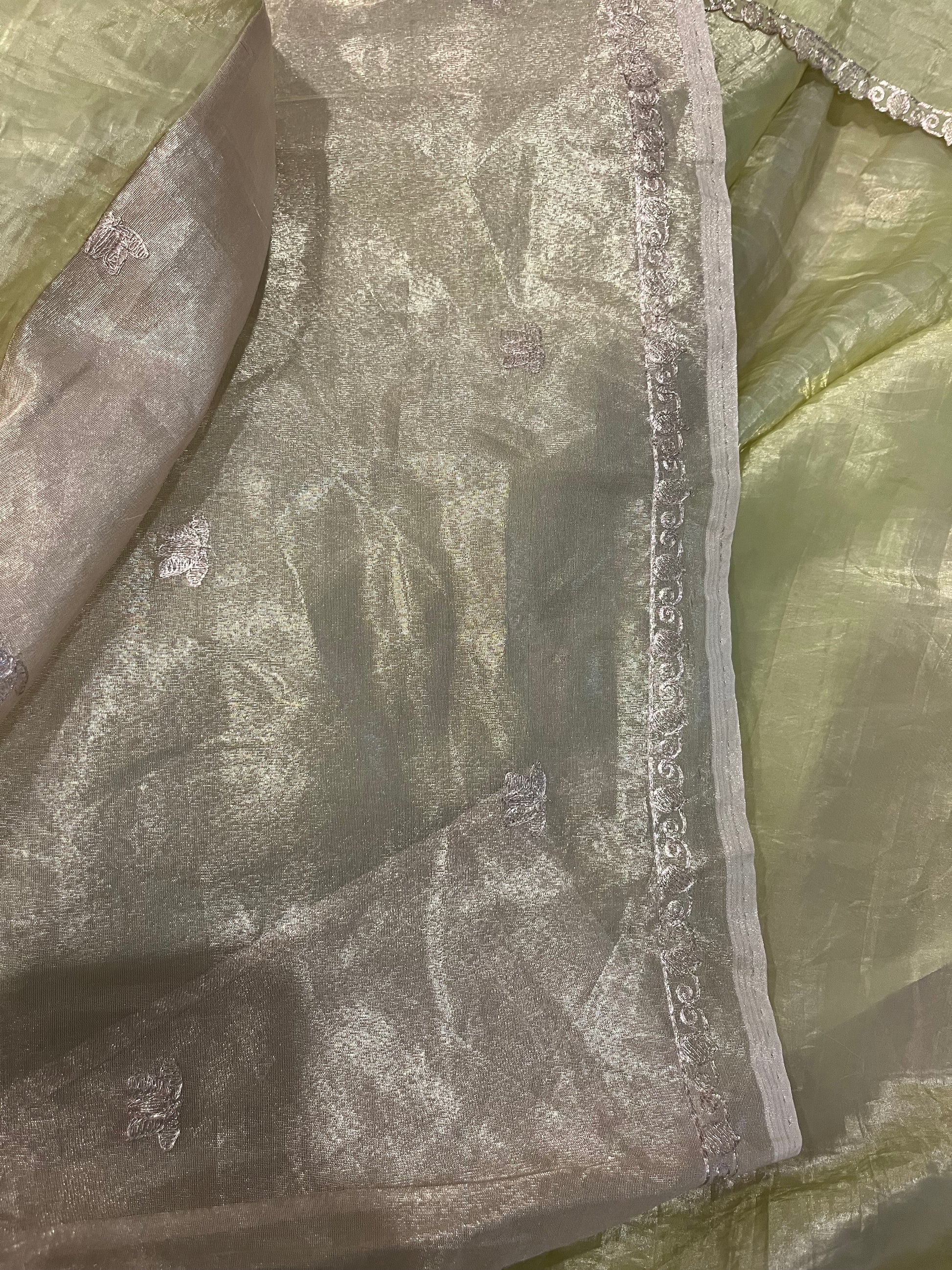 Drape yourself in timeless elegance with our Pitta Work Crepe Tissue Saree – a harmonious blend of tradition and modernity. Crafted on a luxurious crepe tissue base, this saree features the intricate brilliance of Pitta work — delicate hand embroidery done using metallic threads, evoking a regal shimmer and rich texture.