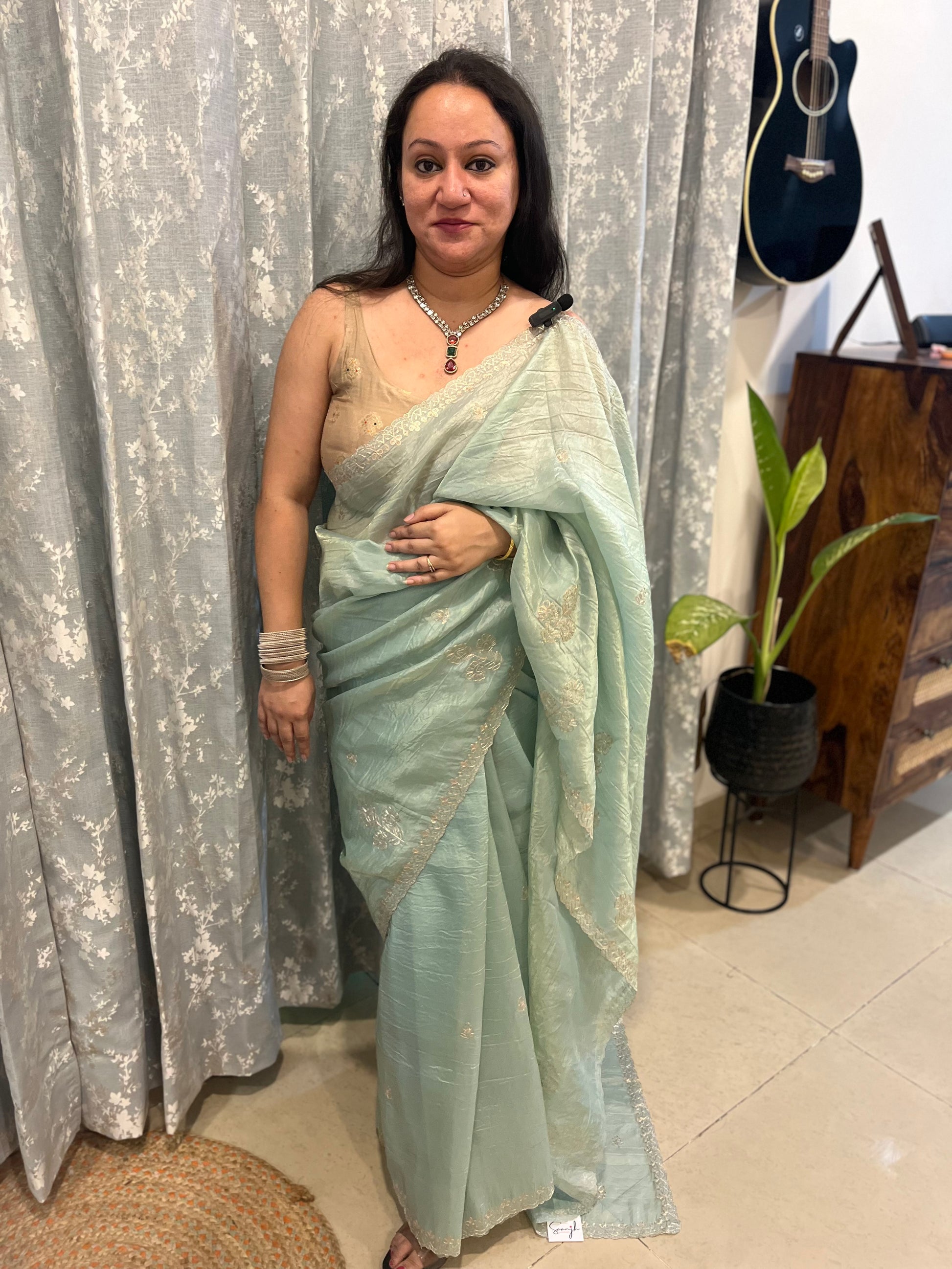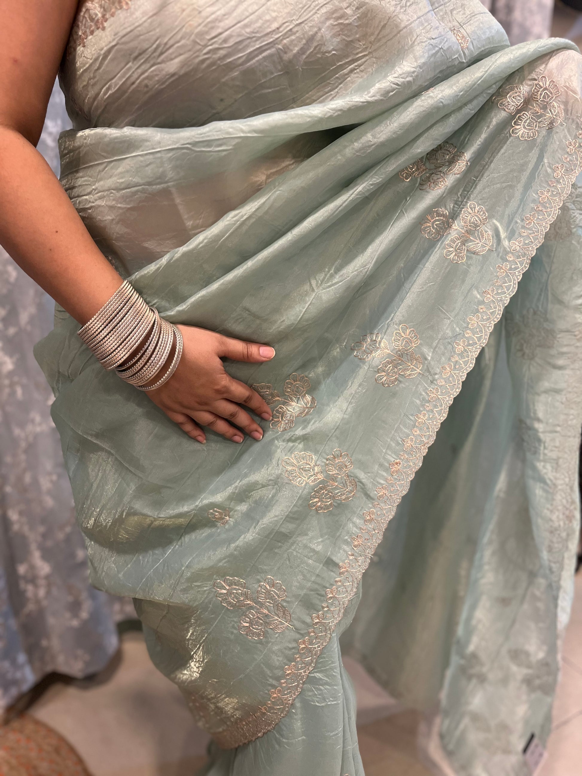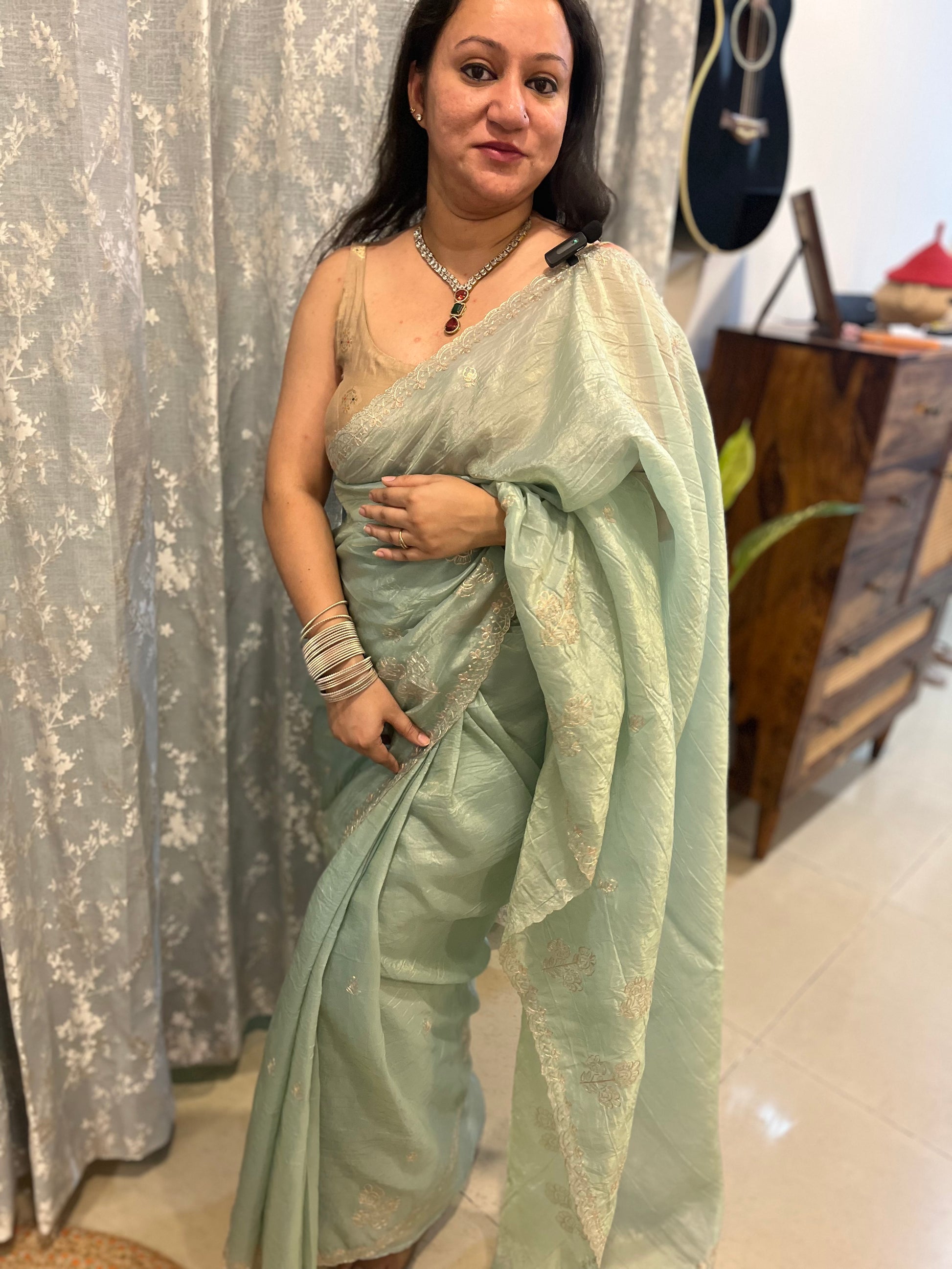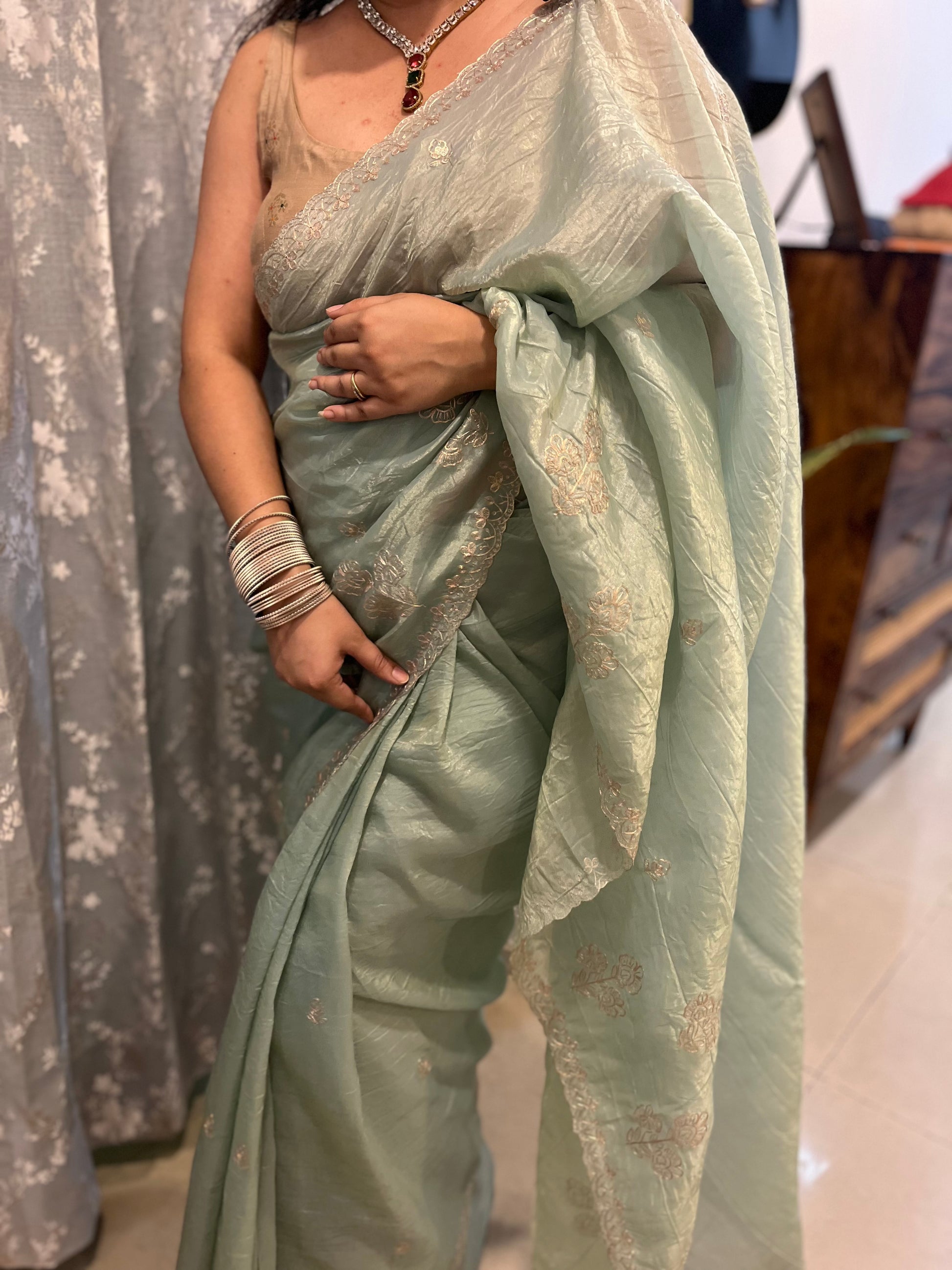 Drape yourself in timeless elegance with our Pitta Work Crepe Tissue Saree – a harmonious blend of tradition and modernity. Crafted on a luxurious crepe tissue base, this saree features the intricate brilliance of Pitta work — delicate hand embroidery done using metallic threads, evoking a regal shimmer and rich texture.