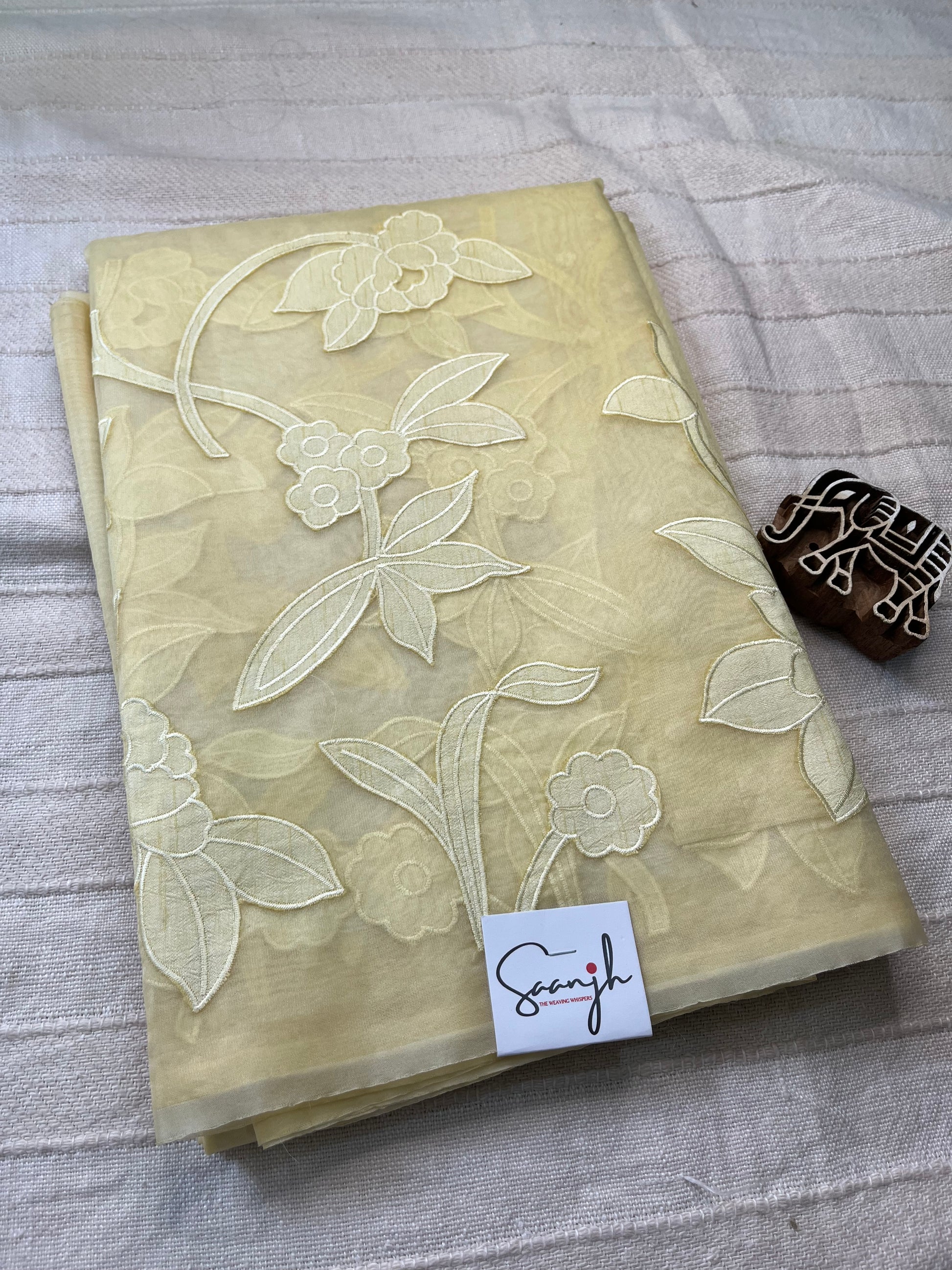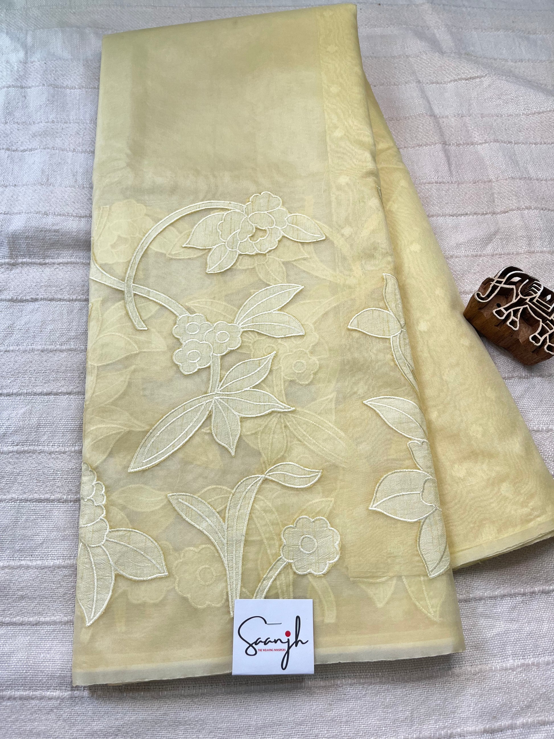 Grace meets craftsmanship in this exquisite pure organza saree adorned with delicate hand appliqué work. Crafted with finesse, this saree is a celebration of traditional artistry and modern elegance.