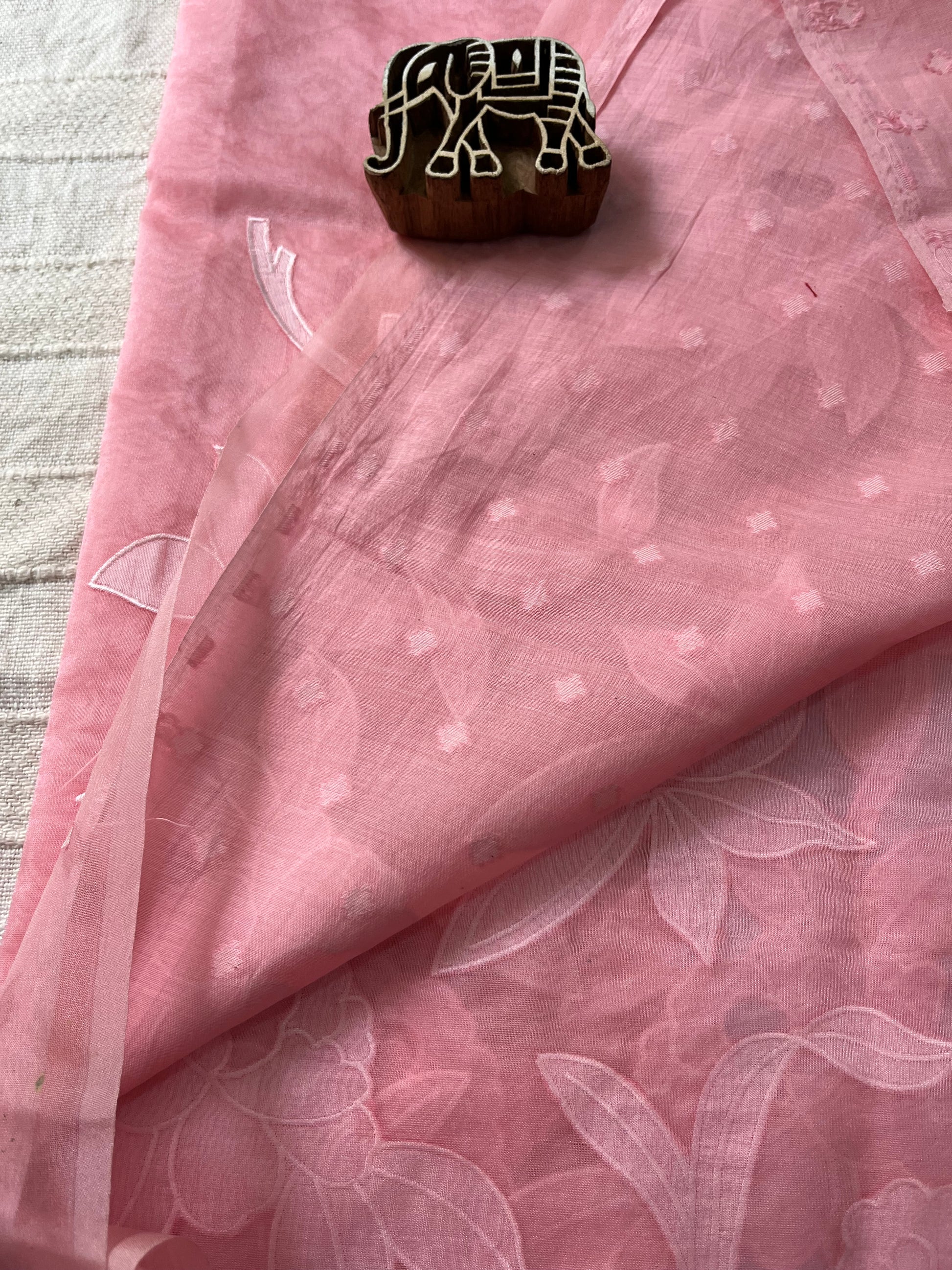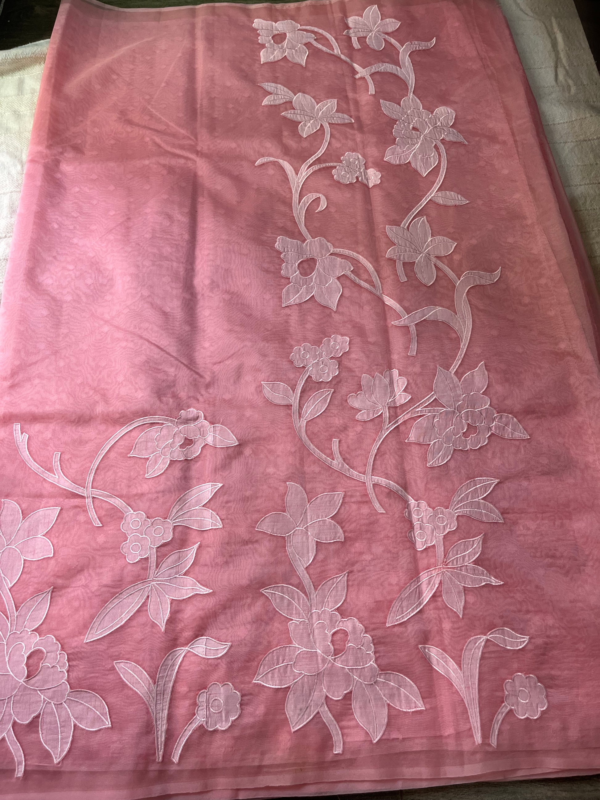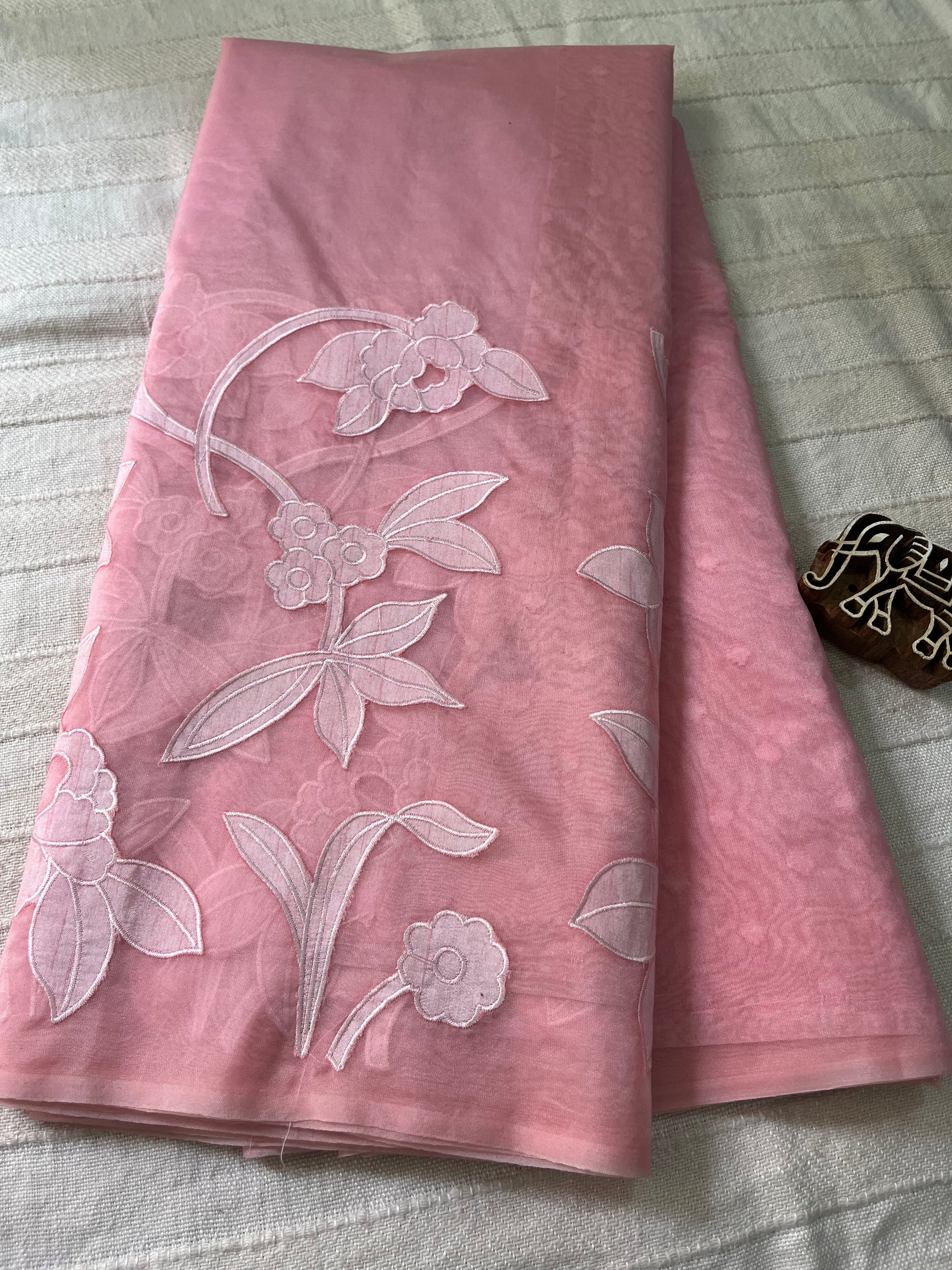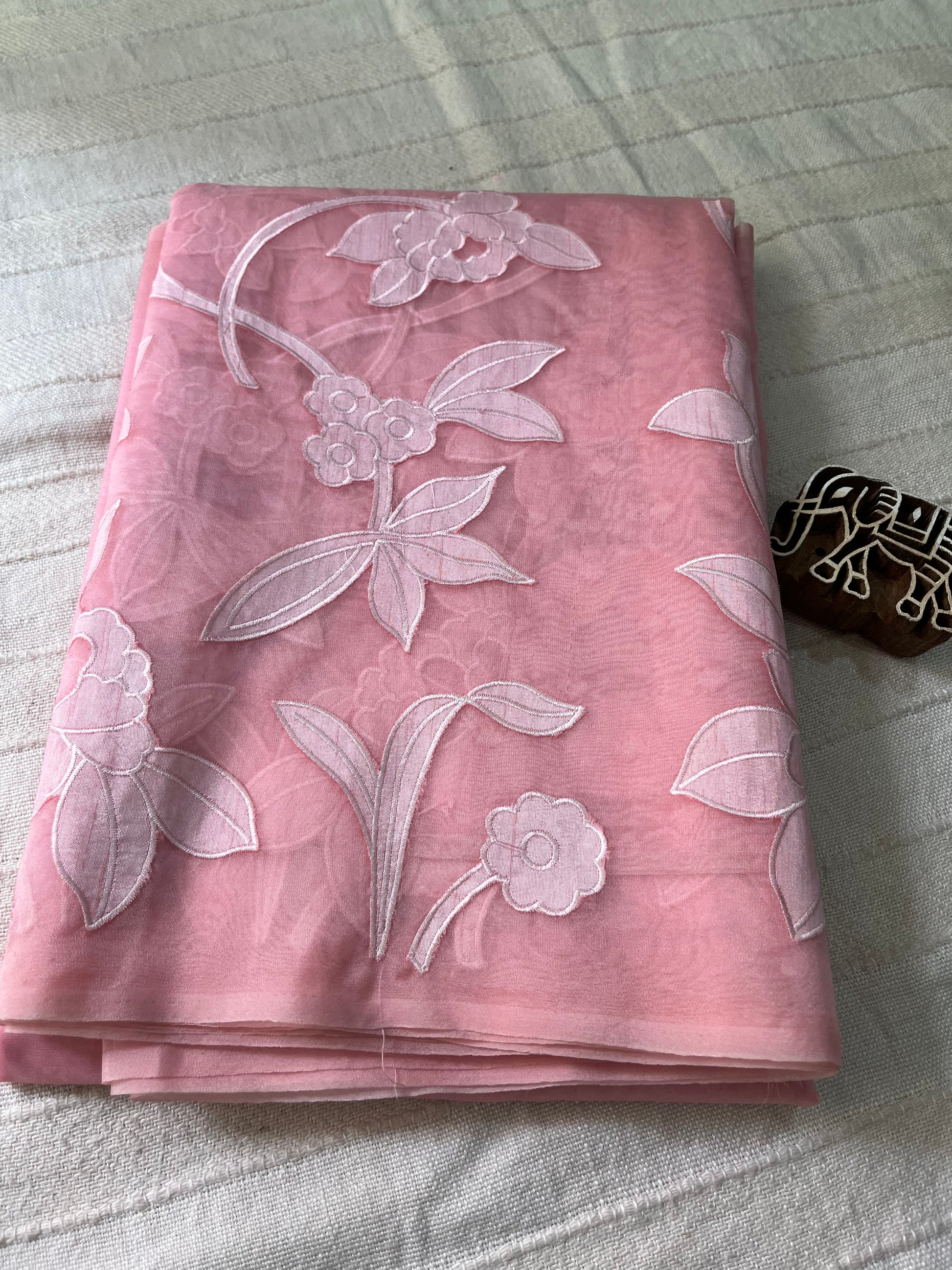 Grace meets craftsmanship in this exquisite pure organza saree adorned with delicate hand appliqué work. Crafted with finesse, this saree is a celebration of traditional artistry and modern elegance.