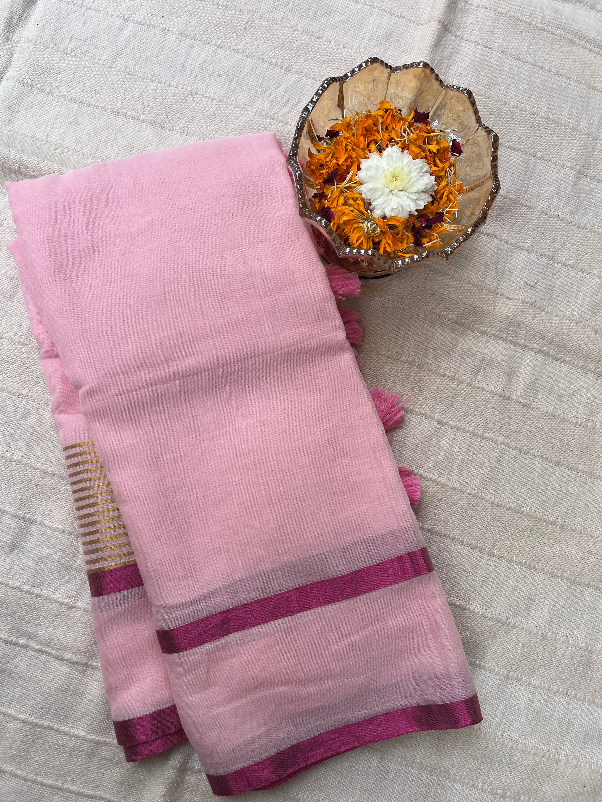 Zari Mul Cotton Saree - Baby Pink with Magenta Border (No Blouse piece)